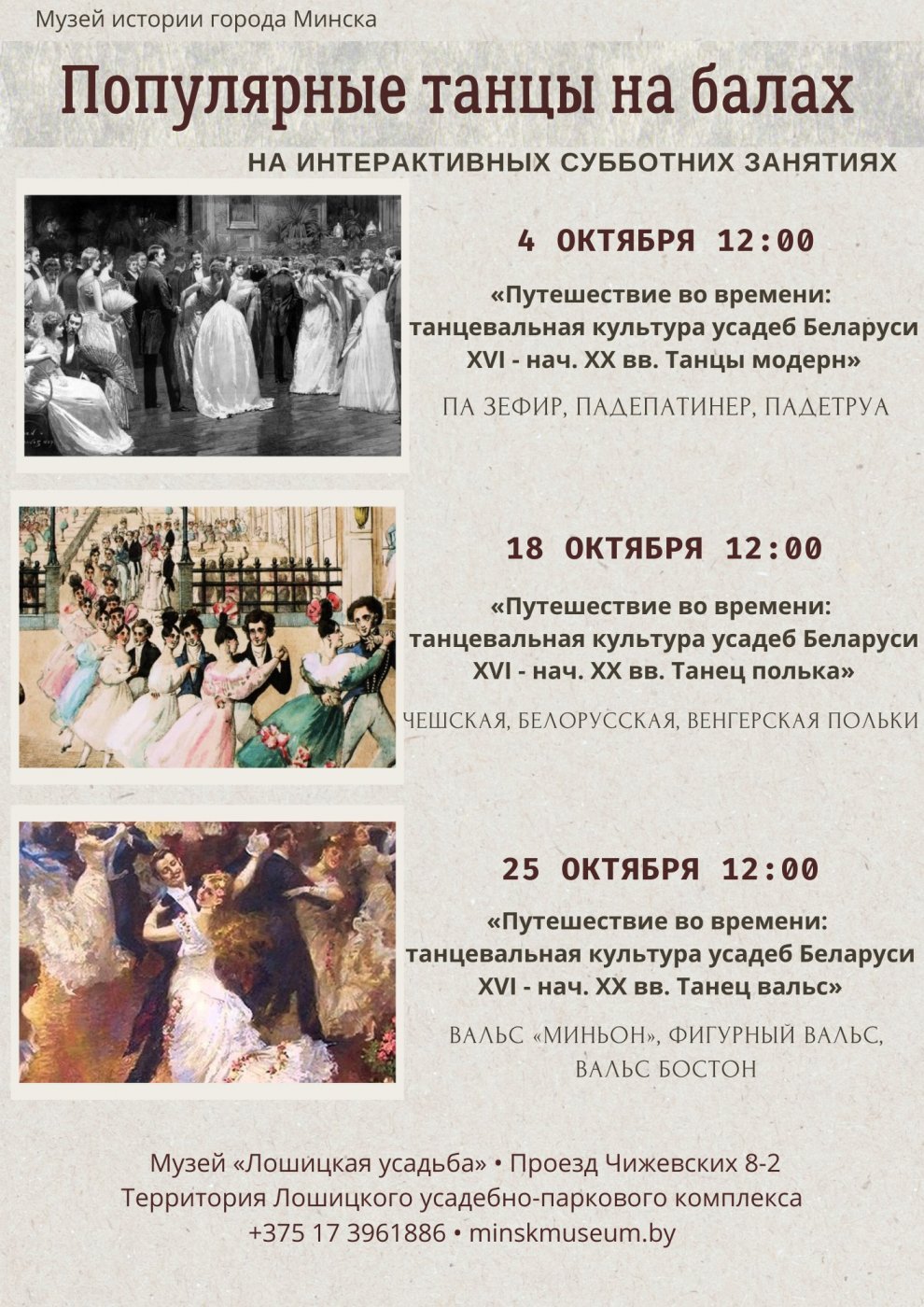 • 25.10, 12:00, «Путешествие во времени: танцевальная культура усадеб Беларуси XVI - нач. XX вв. Танец вальс».