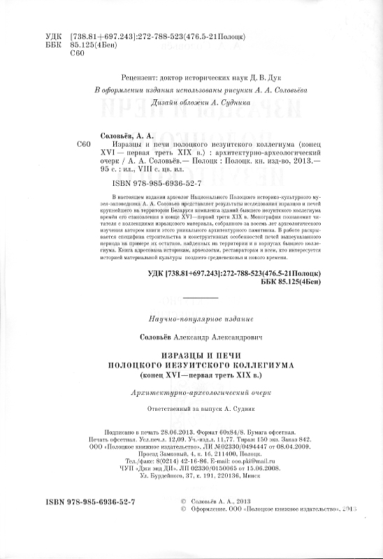 В настоящем издании археолог Национального Полоцкого историко-культурного музея-заповедника А. А. Соловьев представляет результаты исследования изразцов и печей крупнейшего на территории Беларуси комплекса зданий бывшего иезуитского коллегиума времён его становления в конце XVI—первой трети XIX в. Монография познакомит читателя с коллекциями изразцового материала, собранного за восемь лет археологического изучения автором книги этого уникального архитектурного памятника. В работе раскрывается специфика строительства и конструктивных особенностей печей вышеуказанного периода на примере их остатков, найденных на территории и в корпусах бывшего коллегиума. Книга адресована историкам, археологам, реставраторам и всем, кто интересуется историей материальной культуры позднего средневековья и нового времени.